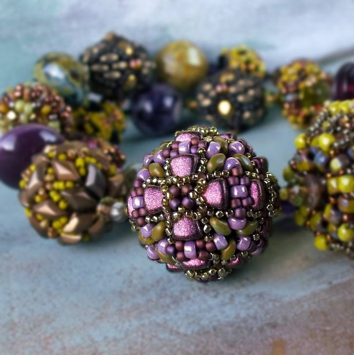 A cube-shaped beaded bead with Matubo Nib-Bits and Miniduo