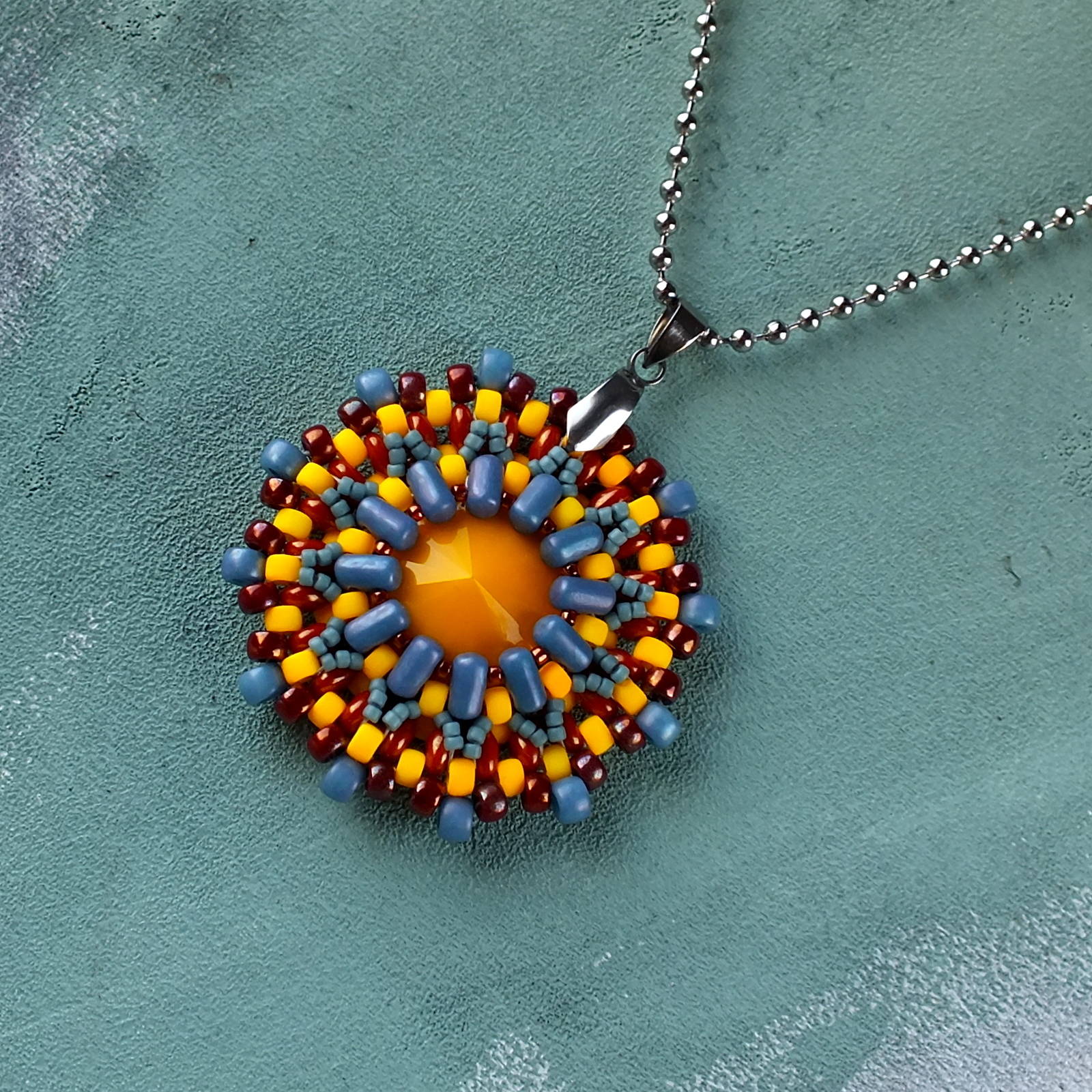 Round pendant with Rulla and Superduo beads and Matubo Rivoli