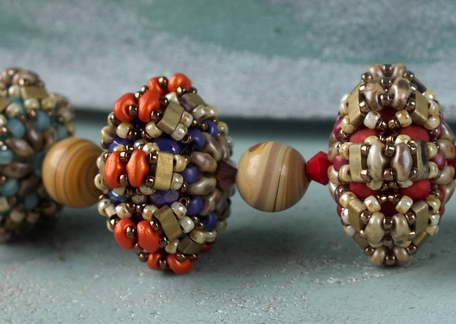 A rondelle-shaped beaded bead with Matubo Miniduos